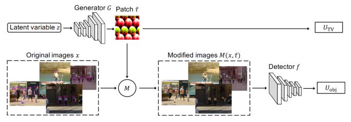 其次再引入对抗纹理的差值总和作为能量函数的另外一部分,表述为$U_{TV}$ 。 $U_{TV}$的值越小,说明生成的对抗纹理越平滑。$U_{\mathrm{TV}}=\sum_{i,j}\left \tau_{i,j}-\tau_{i+1,j}\right +\left \tau_{i,j}-\tau_{i,j+1}\right $因此能量函数为:\(U\left(\widetilde{\tau}\right)=\frac{1}{\beta}\left(U_{\mathrm{obj}}+\alpha U_{\mathrm{TV}}\right)\)