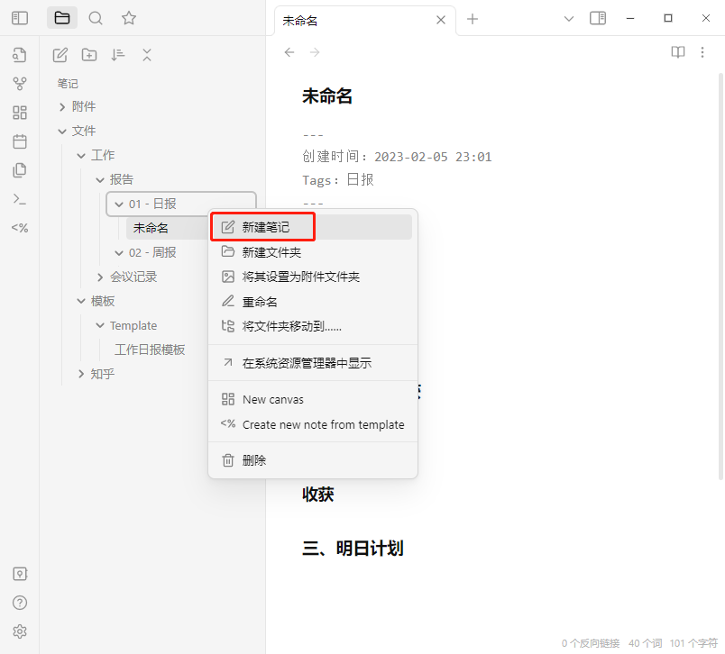 设置好之后,每次你在指定的文件夹里面【新建笔记】时,都会自动以模板生成名字为【未命名】的新文件。
